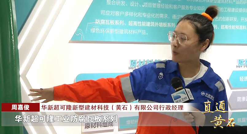 华新超可隆新型建材科技(黄石)有限公司行政经理周嘉俊:“华新超可隆工业防腐瓦板系列,该系列目前是含有屋面瓦和墙面板两个产品,该产品具有抗压弯度高,耐磨防腐性能好,同时兼顾了防紫外线等性能。”