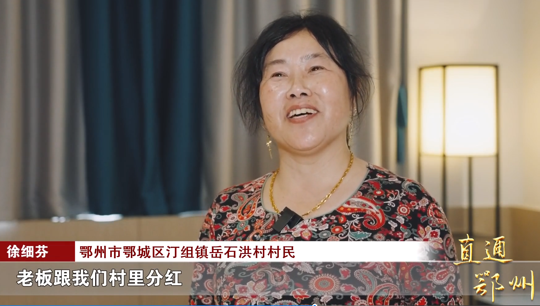 鄂州市鄂城区汀组镇岳石洪村村民 徐细芬:“现在我们在酒店里做 一个月有2600(元),很满意老板跟我们村里分红,村里跟我们农民分红。”