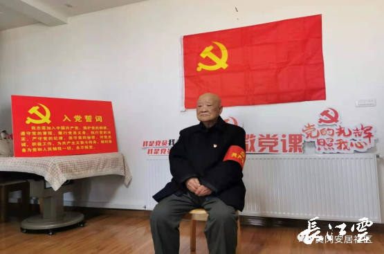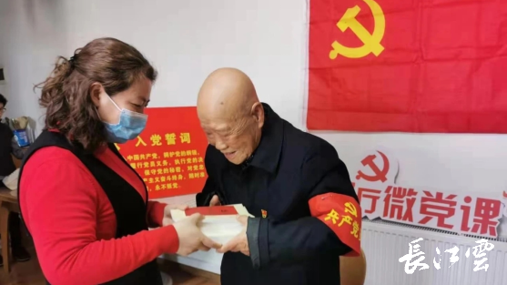 下午3点整,这场只为一名党员准备的特殊支部主题党日正式开始。看到来了这么多同志,孙维学老人难掩激动,心情特别高兴。青年党员周情为老人送上鲜花,为他佩戴党徽和“共产党员”袖章,表达对孙维学老人的敬意。在随后进行的“5+X”环节的标准动作中,现场党员缴纳了一次特殊党费,为孙老购买了学习用品、书籍和党建纪念品。孙维学老人腰板挺直,和大家一起严格按照组织生活流程,同社区支部的党员们一起高唱国歌、重温入党誓词、诵读党章、学习党规党情。