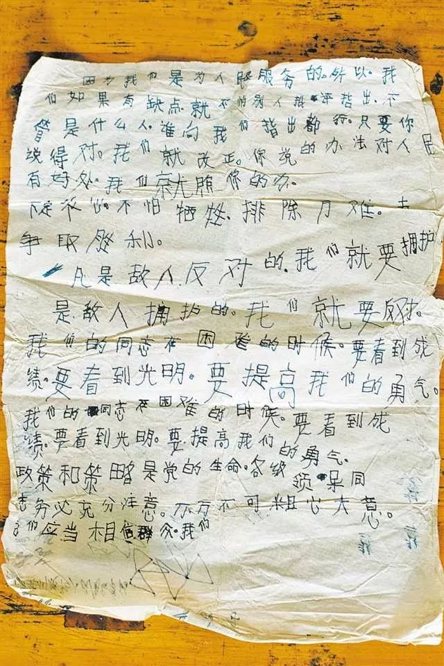 “因为我们是为人民服务的,所以,我们如果有缺点就不怕别人批评指出……只要你说得对,我们就改正。你说的办法对人民有好处,我们就照你的办……”白布包袱里,几张泛黄的纸张正反面都抄满了毛主席的话。50年过去了,纸张仅磨损些许。