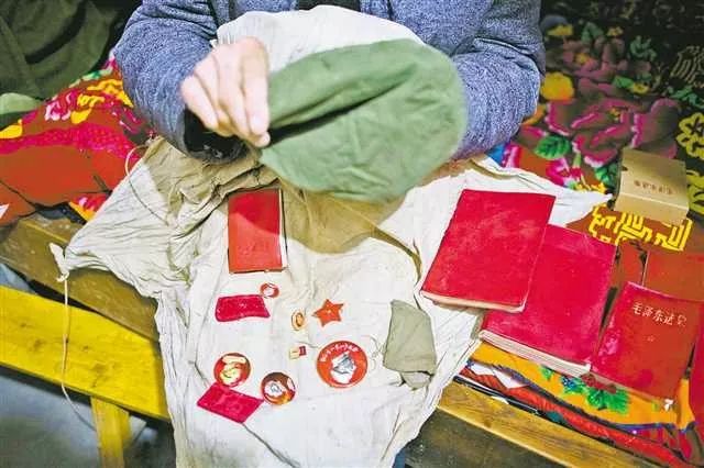 几张已泛黄的纸、4本《毛泽东选集》、两本《毛主席语录》整整齐齐撂成一叠,上面放着两个褪色的红色领章。一个泛白的军用针线包,装着大大小小7个毛主席像章,每一个都被摩挲得发亮。还有一顶军帽,军帽上的红五星鲜艳夺目。