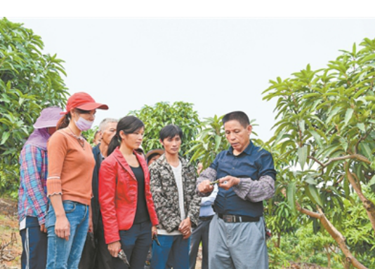 莫文珍在芒果园指导果农如何提高芒果产量。周加孔 摄