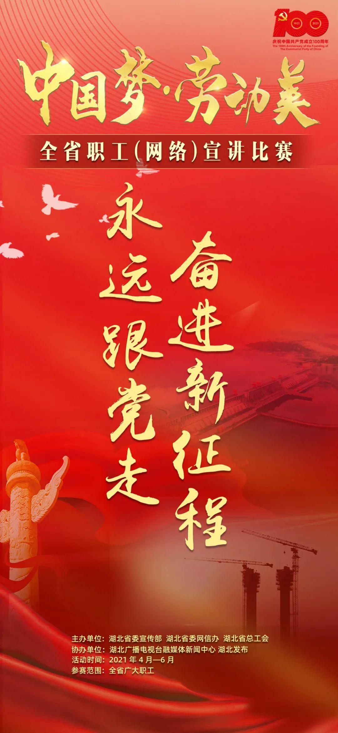 正值庆祝建党百年之际,为推动全省广大职工讲好红色故事,传承红色基因,讴歌中国共产党为人民谋幸福、为民族谋复兴的光辉历程,讲述各行各业职工永远跟党走,坚守奉献的动人故事,多层次、多角度展现全省广大职工在党的领导下立足岗位、建功立业,用劳动和奋斗共推湖北高质量发展的生动实践,湖北省委宣传部、湖北省委网信办、湖北省总工会联合开展“中国梦·劳动美—永远跟党走 奋进新征程”全省职工(网络)宣讲比赛。