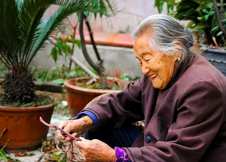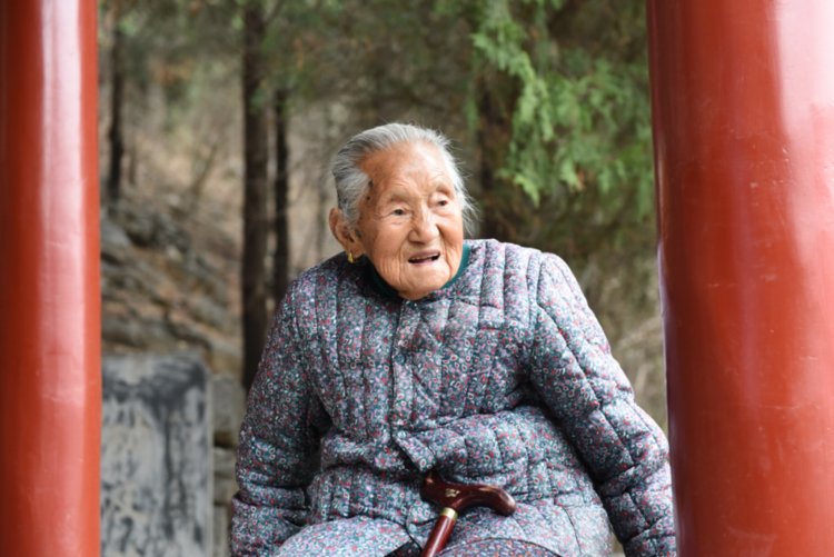 今年98岁的靳月英瘦小的身材,常年穿着补丁摞补丁的粗布斜襟上衣,满手厚厚的老茧,留下岁月的印记。