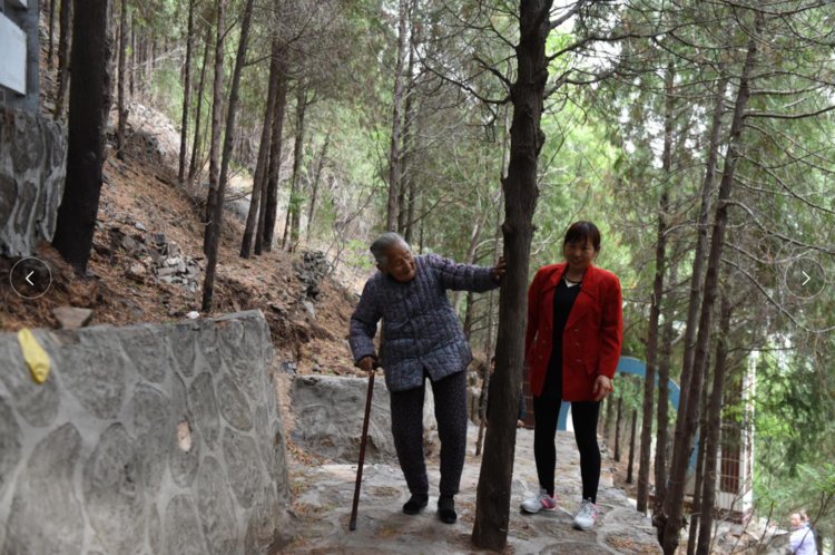 在鱼泉村有一句顺口溜,“种草草不长,栽树难乘凉”要把树种活,谈何容易?树是春天栽,靳月英秋冬就需要刨树坑。石头多,她就把乱石刨松码成围堰。土少,她就背着箩筐从石缝里抠。由于降雨量小,61岁靳月英需要一趟趟从70多度的陡坡上,下山担水,磕碰刮伤是家常便饭。靳月英告诉我:“有时候担水撒了,绊倒就坐那哭两眼,后来一想,你要没有牺牲精神,那你就别搞了,但我还得搞,也有劲头搞,这样就不想着困难了。”
