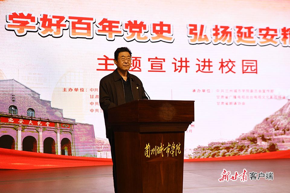 “党的百年史是一部从苦难走向辉煌的历史,中国共产党的初衷是为中国人民谋幸福、为中华民族谋复兴……”暮春时节,兰州城市学院音乐厅内气氛热烈、座无虚席,“学好百年党史、弘扬延安精神”党史宣讲进校园活动正在这里举行。在台上作宣讲报告的是甘肃省延安精神研究会副会长、原甘肃行政学院常务副院长石玉亭,他的精彩讲述引来现场师生的阵阵掌声。