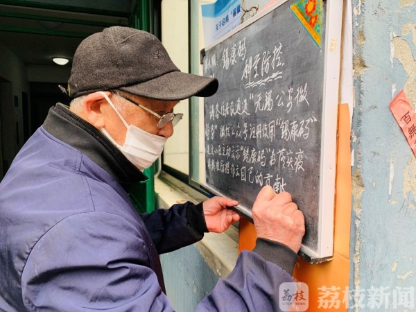 “我也去报名志愿服务的,但是社区(党总支)书记跟我说,老年人属于易感人群,叮嘱我还是在家尽量少出门。”周英荣笑着跟我们说,“那我就想啊,现在全国都在为防疫做工作,我也要出一点力量。我就在楼道门口放了一个小黑板,把专家讲的防疫知识、疫情的形势、提醒的注意点写上,这样大家进出楼栋都能看见,起到一个提醒作用。”