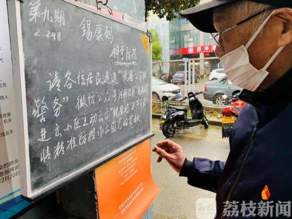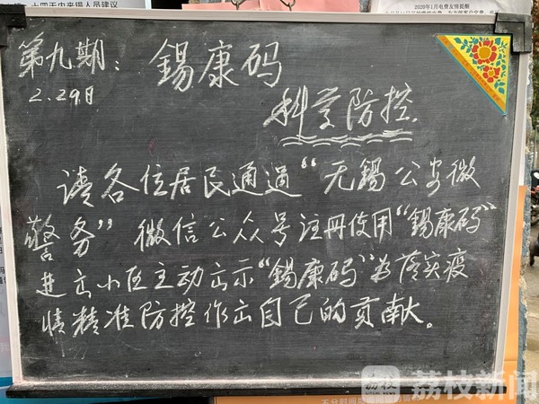 “请各位居民通过‘无锡公安微警务’微信公众号注册使用‘锡康码’,进出小区主动出示‘锡康码’……”2020年2月29日,无锡市新吴区新安街道新安花苑第二社区229栋门口,88岁老党员周英荣正在小黑板上一笔一划地写着,结合“锡康码”的推广开展楼栋宣传。自社区疫情防控工作以来,小黑板就是老周的战疫“阵地”。