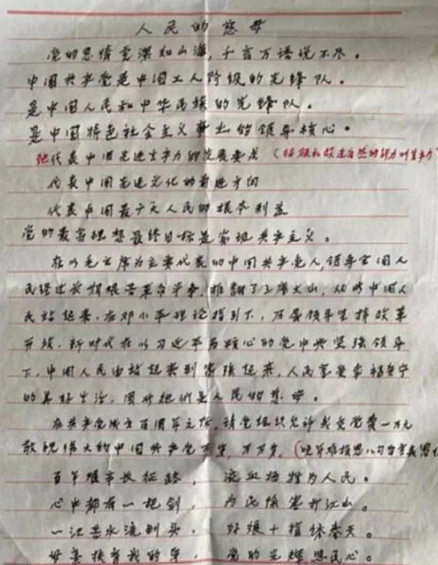 老人带来了一份特殊的礼物,一份手写稿,标题为《人民的慈母》,文章的结尾有一首诗“百年艰辛长征路,流血牺牲为人民;心中都有一把剑,为民除害打江山。一江苦水流到头,好娘十指绣春天;母亲抚育我的身,党的光辉照民心”。语句虽然简单朴素,但每一句无一不满怀对党的感激之情;字迹虽刻满岁月的痕迹,但每一字无一不彰显一名7旬老人入党36年来不改的初心。
