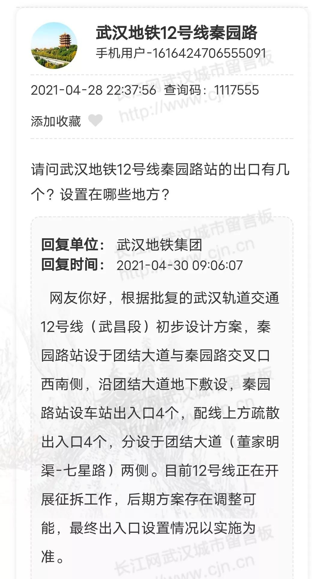 网友:地铁12号线秦园路站的出口有几个?设置在哪些地方?