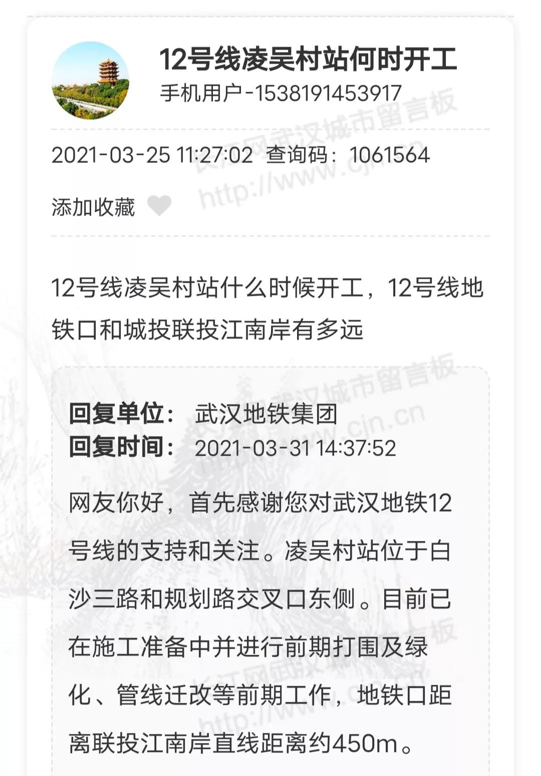 武汉地铁集团:凌吴村站位于白沙三路和规划路交叉口东侧。目前已在施工准备中并进行前期打围及绿化、管线迁改等前期工作,地铁口距离联投江南岸直线距离约450m。