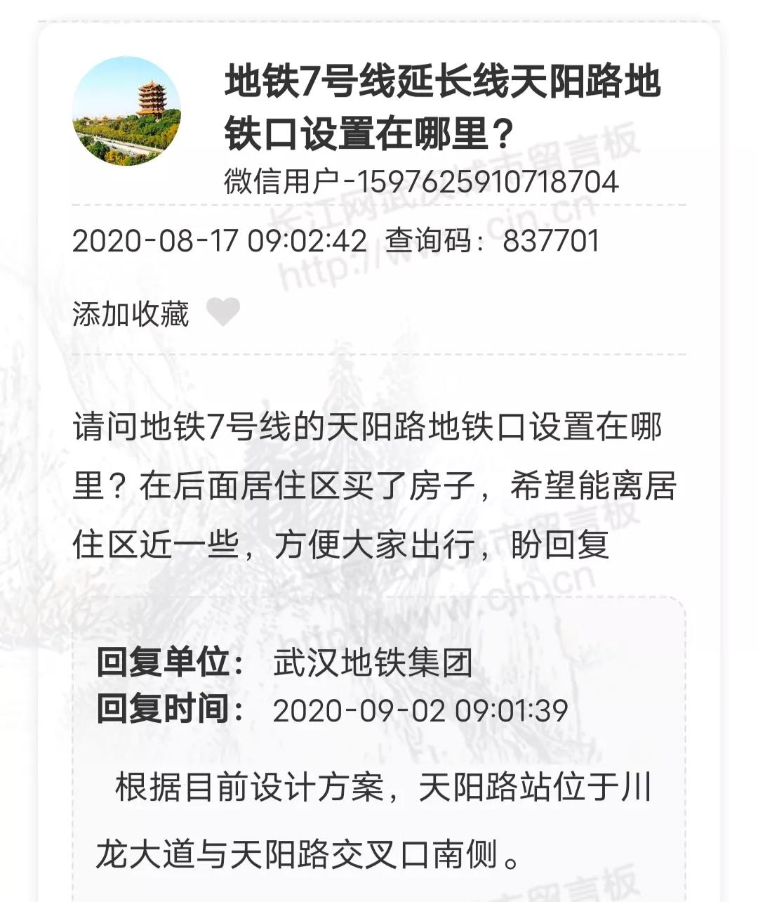 武汉地铁集团:根据目前设计方案,天阳路站位于川龙大道与天阳路交叉口南侧。