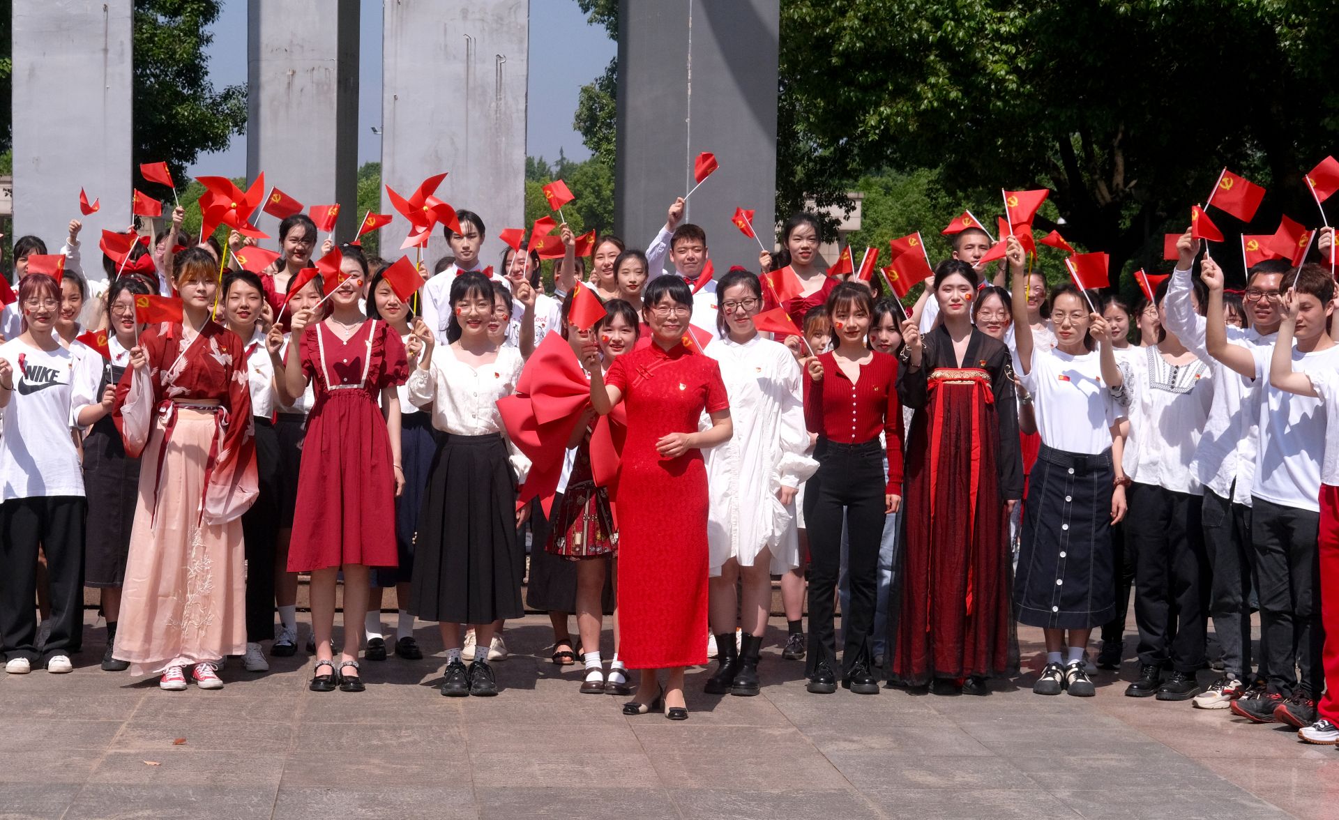 活动现场贯穿着丰富的红色元素,刺绣的党旗、历史厚重的汉服、温婉大气的旗袍、仙气飘飘的红裙子、带有纺大LOGO的红窗花、带有节日气息的红风车、红领结..........活动设计充分展现服装专业元素,利用服饰搭配、服装展示、智能服装大数据等方式充分挖掘红色育人资源,使红色基因渗入血液、融入血脉、浸入心扉,落地生根,服装青年学子以这样特有的方式表达对党的赤诚之心。