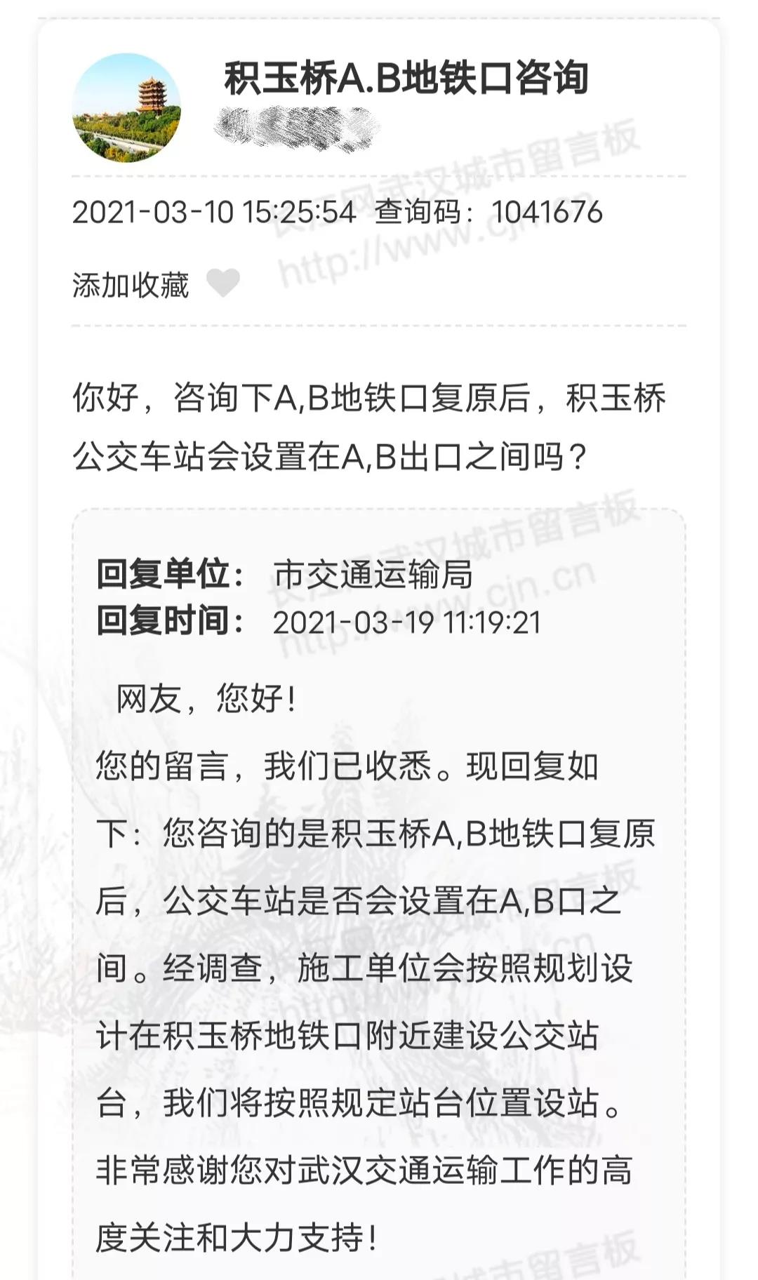 近期,在武汉城市留言板上,有不少网友咨询公交站点设站问题,部门对此作出了回应。