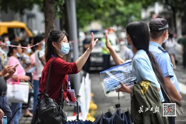2020年7月8日中午,武汉市第十四中学考点,送考老师为考生加油鼓劲。记者苗剑 摄