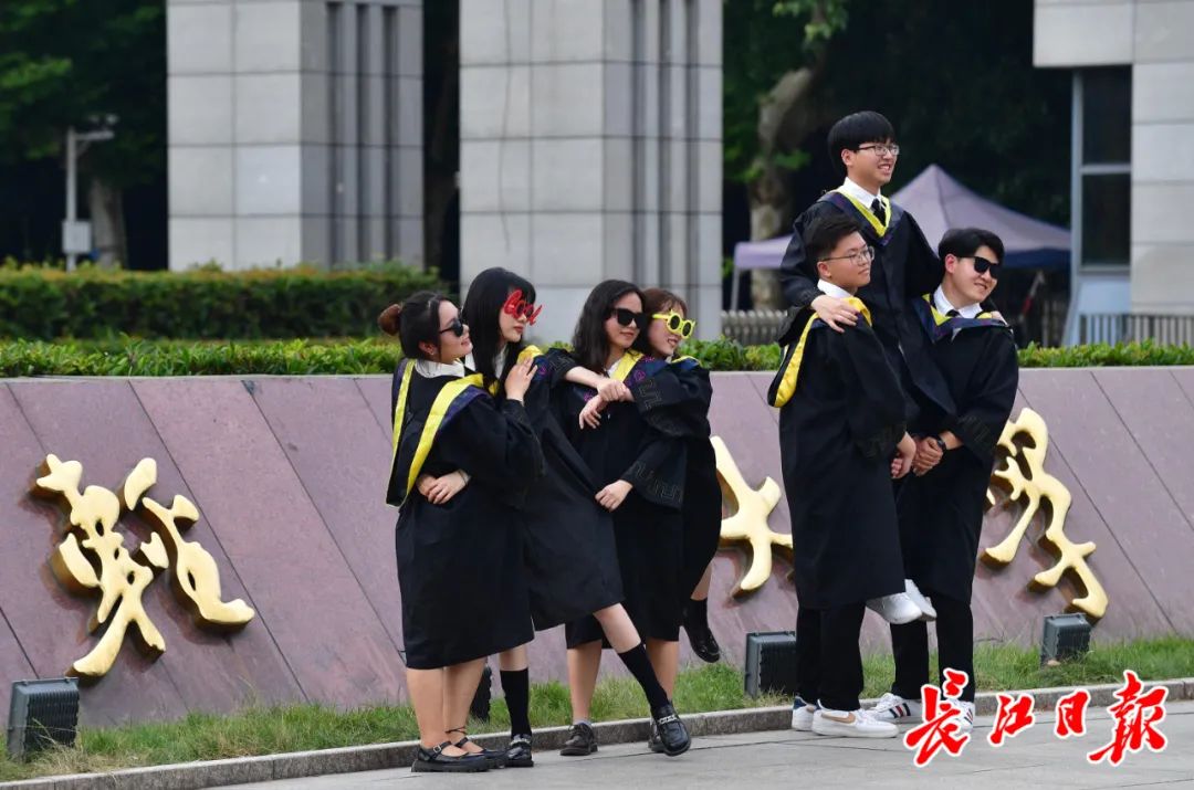 6月2日,武汉轻工大学校门口,今年毕业的学生,身穿统一的学士服拍照留影。记者李永刚 摄