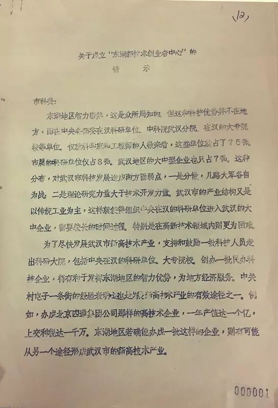 (图为《关于成立东湖新技术创业者中心的请示》)