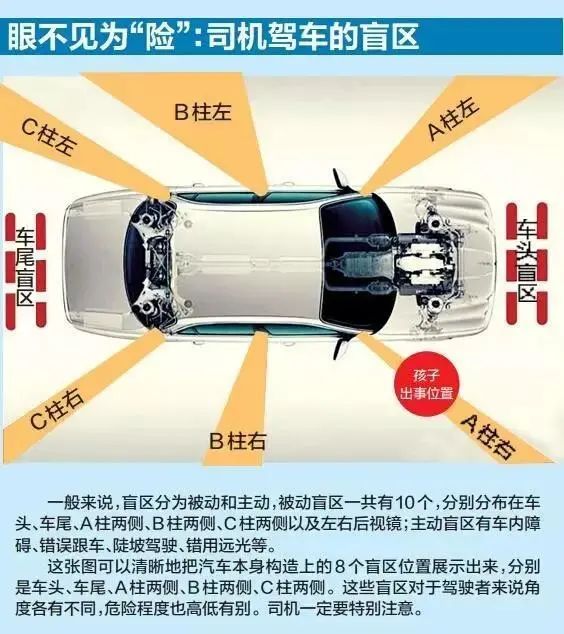 当孩子在盲区内蹲下停留、玩耍时,司机在驾驶室内无法看到,很容易发生碰撞事故。