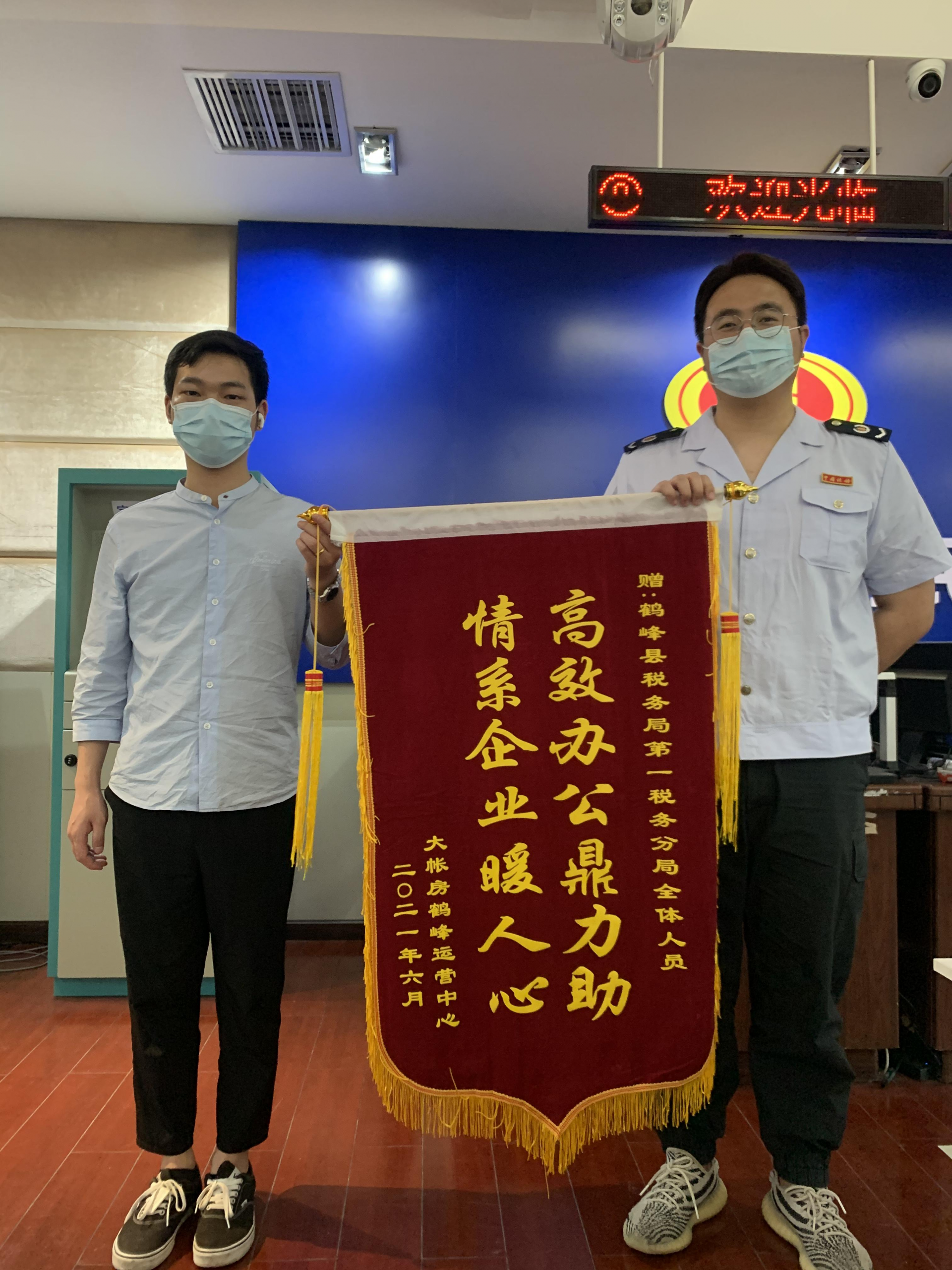 6月9日,大账房鹤峰运营中心的的会计人员龚先生,将一面写有“高效办公鼎力助,情系企业暖人心”的锦旗送到鹤峰县税务局第一税务分局,对该分局高效、贴心的服务表示感谢。