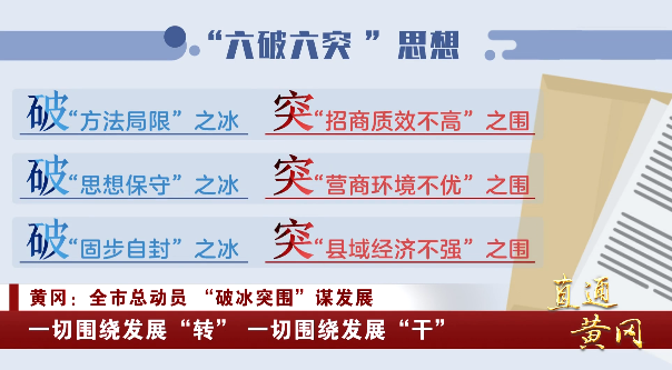 ——4月30日,黄冈市委常委会会议首次完整地提出“六破六突”思想:要破“精神懈怠”之冰,突“发展气场不足”之围;破“路径依赖”之冰,突“产业体系不优”之围;破“观念陈旧”之冰,突“项目支撑不力”之围;破“方法局限”之冰,突“招商质效不高”之围;破“思想保守”之冰,突“营商环境不优”之围;破“固步自封”之冰,突“县域经济不强”之围。