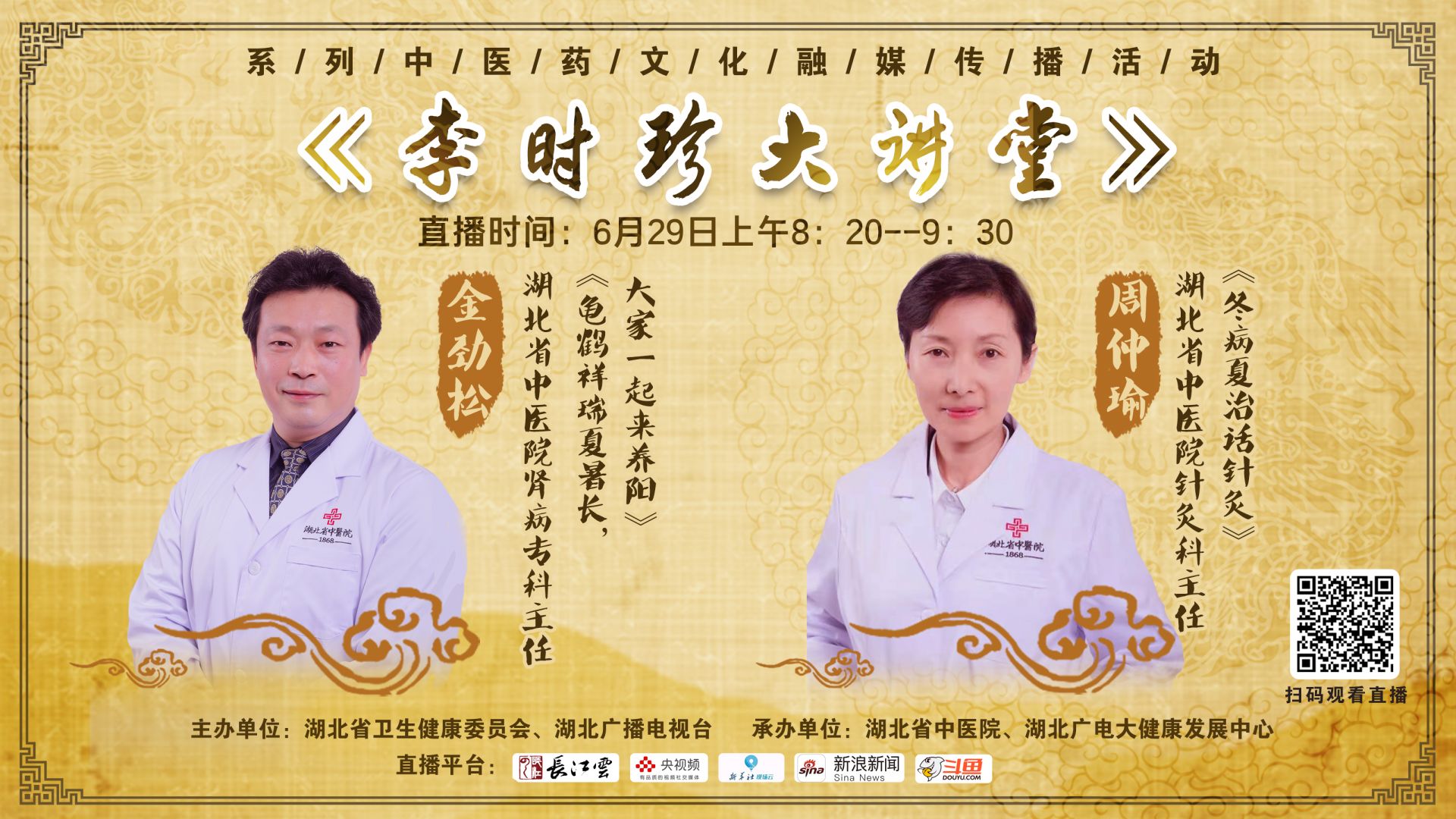 6月29日上午8:20,由湖北省卫生健康委员会和湖北广播电视台共同策划举办的大型中医药系列融媒直播节目——《李时珍大讲堂:冬病夏治 未雨绸缪筑健康》成功上线。