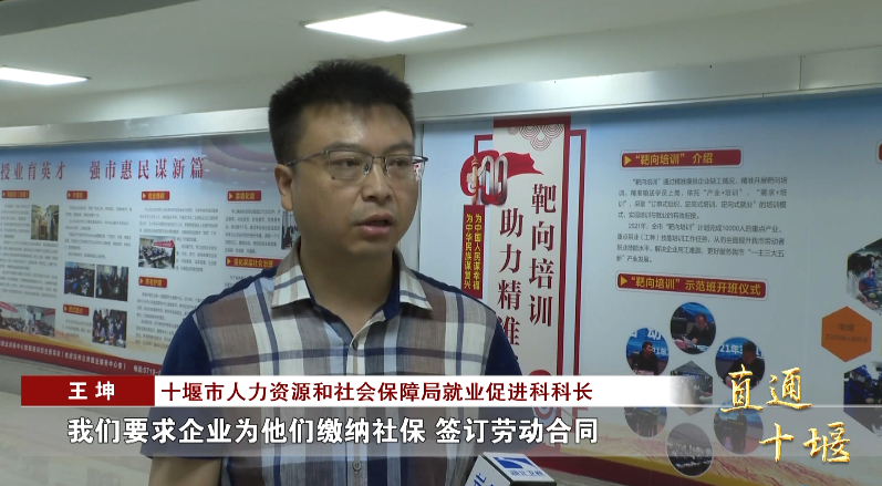 十堰市人力资源和社会保障局就业促进科科长 王坤:“深入地靶向摸排企业用工的需求,靶向培训,因材施教,靶向输送,就业上岗,定向输送到企业去了以后,我们要求企业为他们缴纳社保,签订劳动合同,同时薪酬待遇也有一定的保障。”