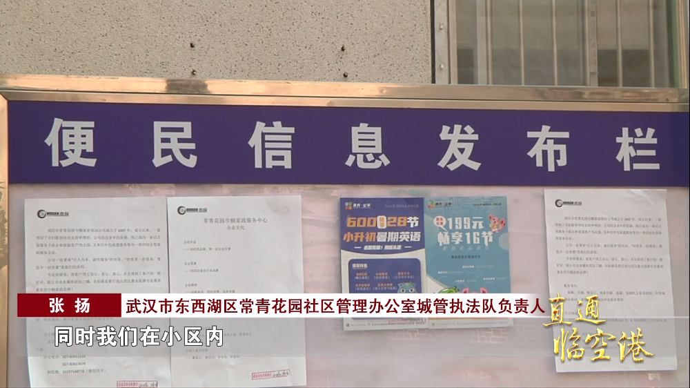 武汉市东西湖区常青花园社区管理办公室城管执法队负责人 张扬:“如果说他们是有公益性的相关的活动,我们会跟社区积极联系,也帮助他们一起来共同发布相关的信息。同时我们在小区内也设置了便民信息发布点、发布栏。”