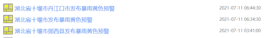 十堰市气象台2021年07月11日06时34分发布暴雨黄色预警信号:预计未来6小时,丹江口中部、北部部分站点累计雨量将达50毫米以上,局部伴有雷电,阵风4-6级,请注意防范山区山洪、地质灾害、中小河流洪水。(预警信息来源:国家预警信息发布中心)