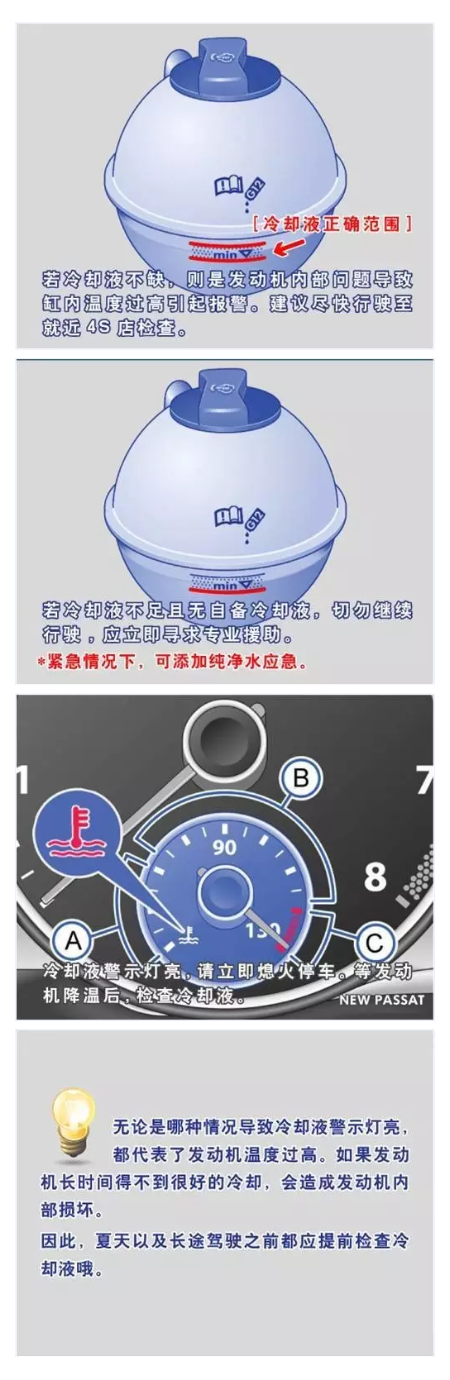 发动机处于冷态时冷却液液位应处于膨胀罐侧面的标记范围内。夏季温度高,如果冷却液的浓度和高度不在正常范围内。容易造成发动机故障甚至开锅。