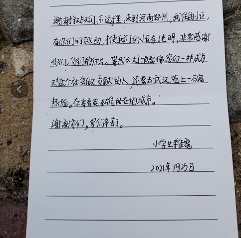 “谢谢叔叔们,不远千里来到河南郑州,我住的小区,有你们的救助,才使我们的小区有了光明,非常感谢你们,你们的付出。等我长大了,也要像您们一样成为对这个社会做贡献的人,还要去武汉吃上一碗热干面。在看看英雄所在的城市。谢谢你们,你们辛苦了。”这是一封带有几个错别字,句句显童真却字字露真情,来自河南郑州的小姑娘李佳霓赠与国网武汉市黄陂区供电公司援豫人员的“无声”感谢信。