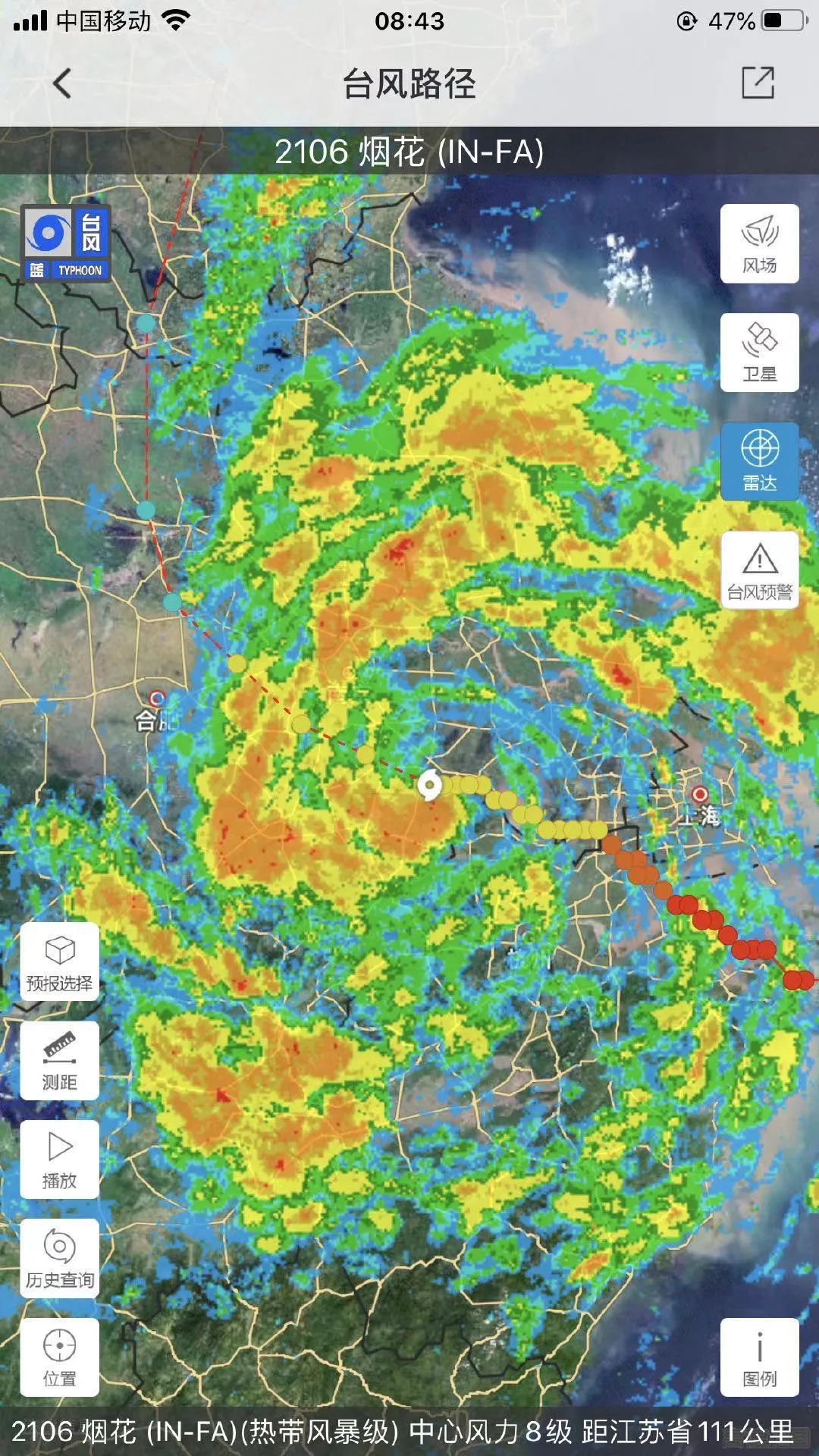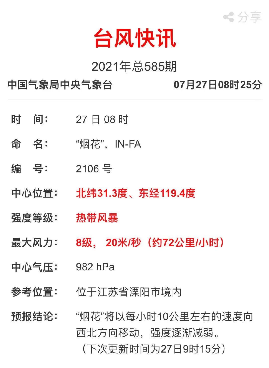 #台风烟花#(热带风暴级)的中心27日08时位于江苏省溧阳市境内,中心附近最大风力8级(20米/秒),中心最低气压为982百帕,“烟花”将以每小时10公里左右的速度向西北方向移动,强度逐渐减弱。