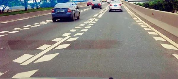 在虚线或者实线两边都画有减速线,这是新国标中规定的车行道纵向减速标线(中间是虚线可变线,实线则不可),主要是设置在一些需要减速的弯道、坡道或者桥梁等位置,提醒驾驶员减速慢行。这种标线虽然少见,但是设计得十分科学,宽宽的菱形虚线布置在车道两侧,会使车道有一种变窄的视觉压迫感,即使对于不熟悉的驾驶员来说也会下意识的减速慢行。