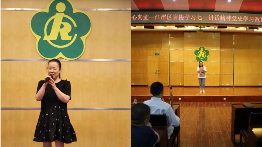 活动现场,江岸区盲协副主席范晓东与盲协秘书长张莹诵读了习近平总书记在庆祝中国共产党成立一百周年大会上的讲话的重要内容,和现场朋友一起重温党的百年征程,感受祖国的沧桑巨变,牢记初心使命,坚定理想信念。