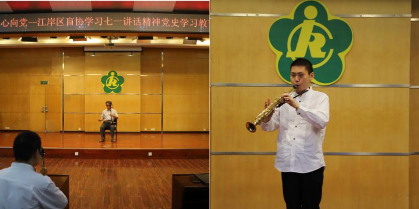 视障人士高博(右)萨克斯演奏《不忘初心》