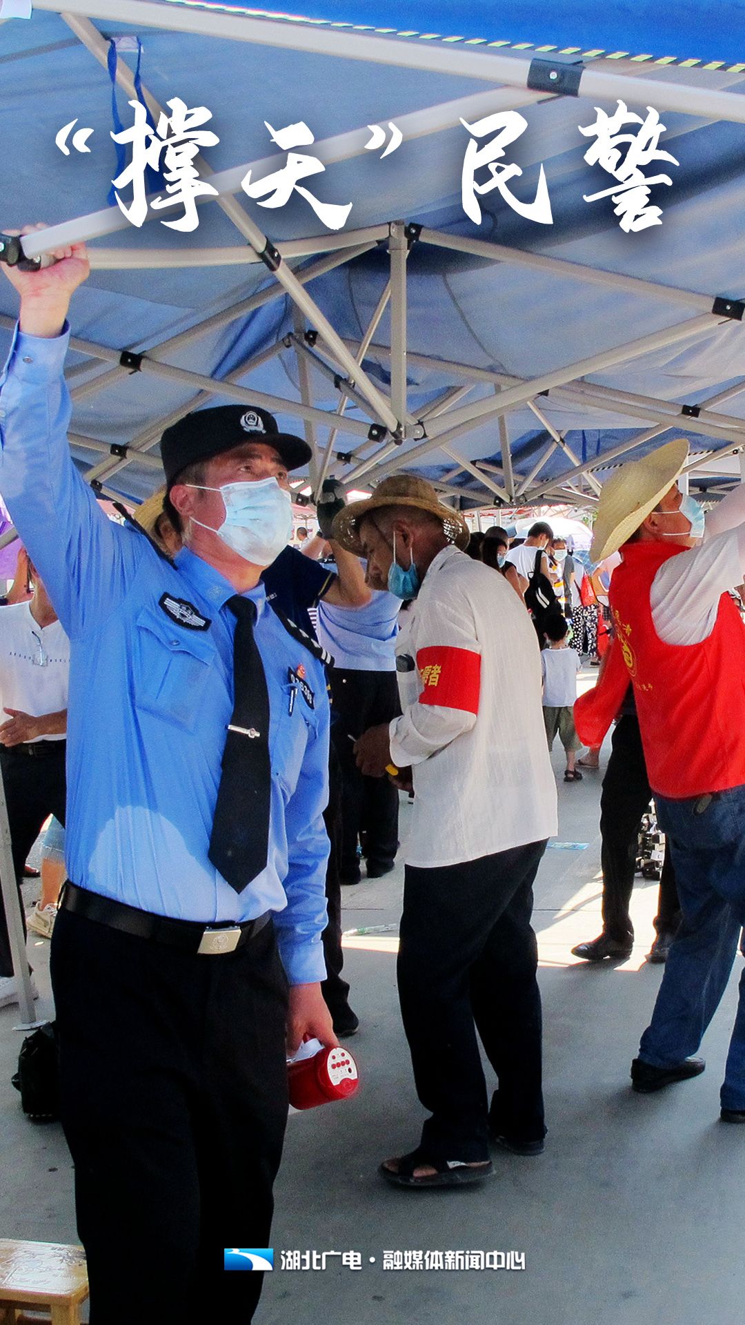 8月3日上午7点,武汉长青街派出所民警早早来到核酸检测点,与街道、社区群干挥汗如雨抢搭遮阳棚,为前来检测核酸的居民提供一片荫凉。不一会儿,他们的制服已被汗水浸透。