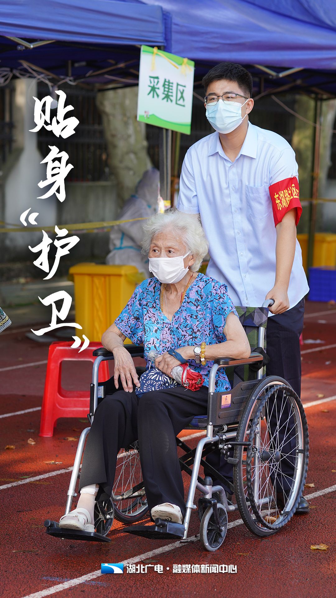 在武汉东湖路一核酸检测现场,一名志愿者小心翼翼地推着白发苍苍的老人家去做核酸检测,这一幕,暖极了。