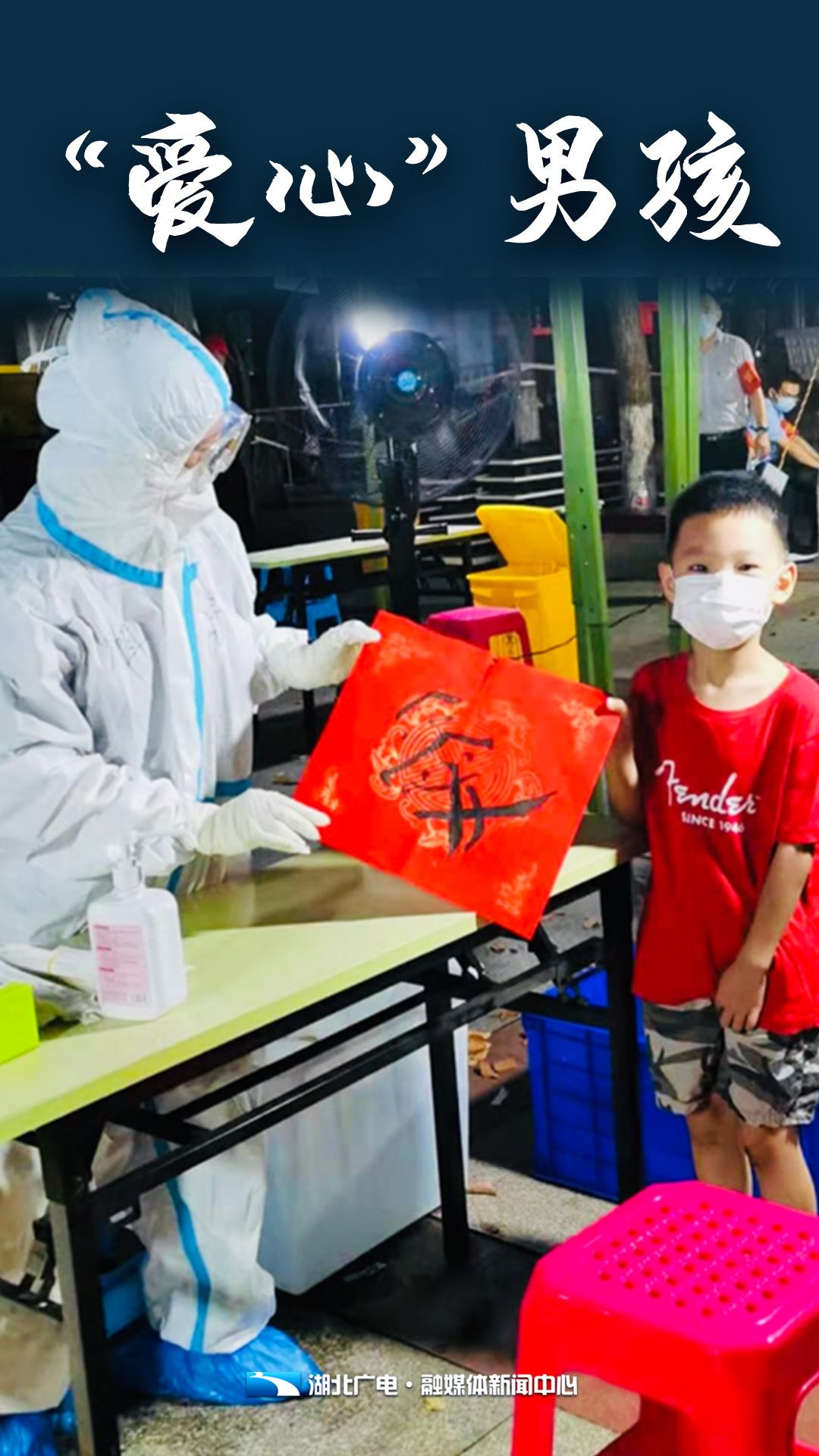 8月5日,刚满6岁的武汉市民小宸宸,用毛笔写下一个拥有“心”的“愛”字,送给为他查核酸的护士肖唯手中。护士肖唯在收到爱心礼物后欣喜不已:“小朋友的爱心礼物让我觉得,这段时间再辛苦都值得,武汉是一座充满爱的城市。”