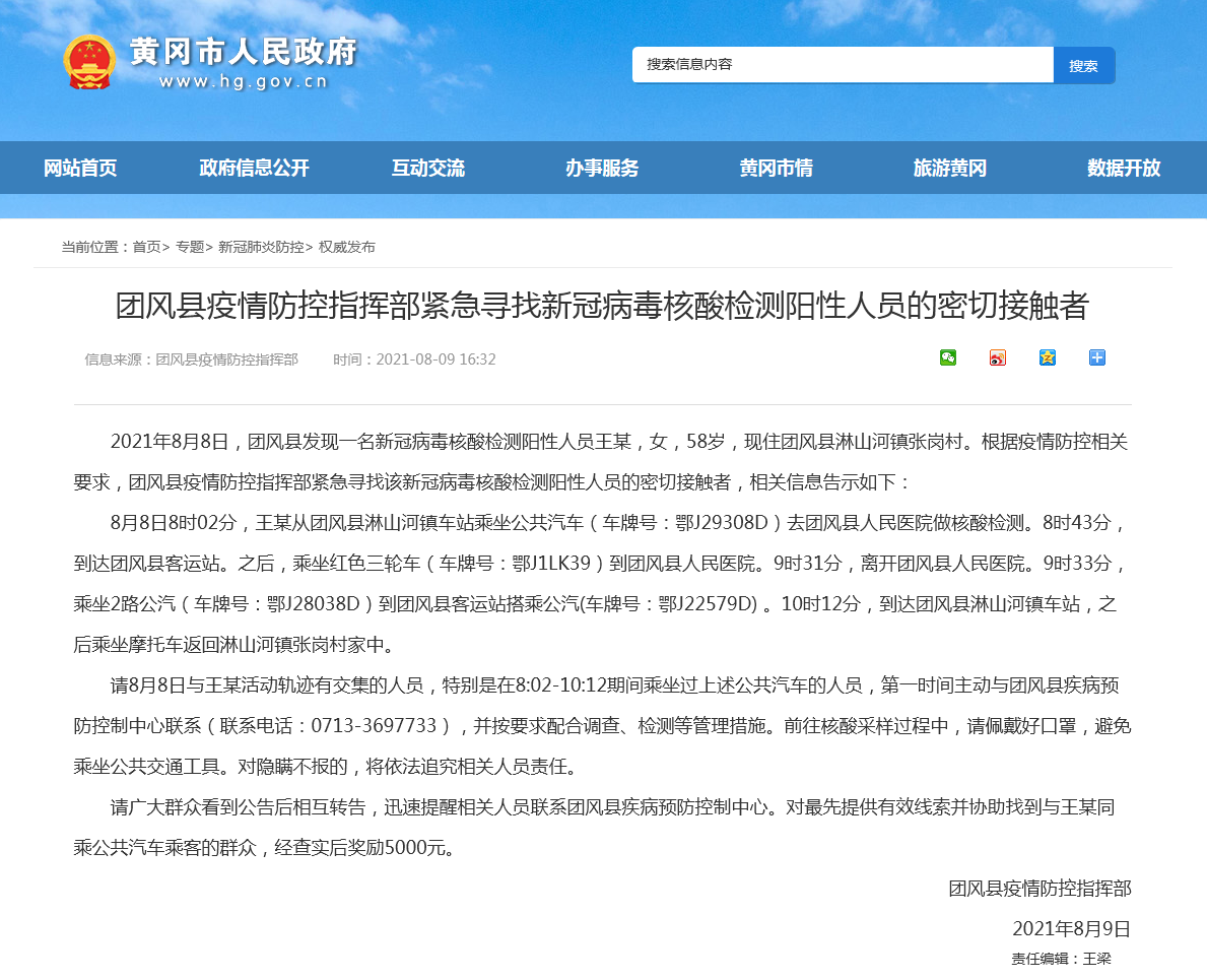 请广大群众看到公告后相互转告,迅速提醒相关人员联系团风县疾病预防控制中心。对最先提供有效线索并协助找到与王某同乘公共汽车乘客的群众,经查实后奖励5000元。