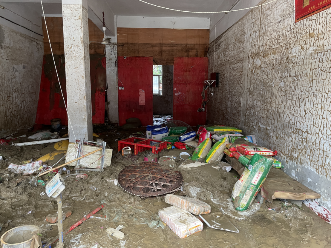 一位粮油经营铺的店主正在进行清理的工作,他无奈地说:“现在这个损失也有差不多上十万了,但是人没事就好,这是最重要的!”