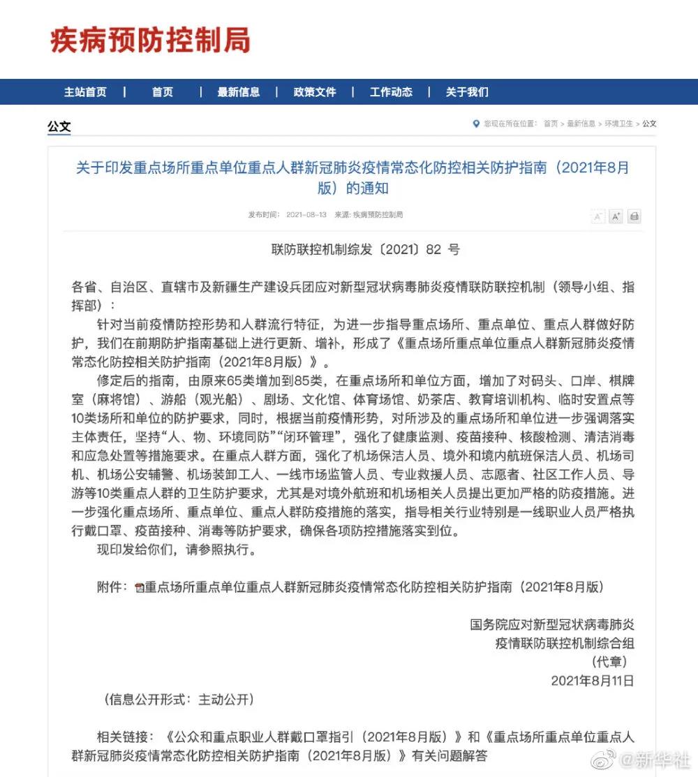 国家卫健委发布《重点场所重点单位重点人群新冠肺炎疫情常态化防控相关防护指南(2021年8月版)》,明确重点场所重点单位重点人群增加至85类。