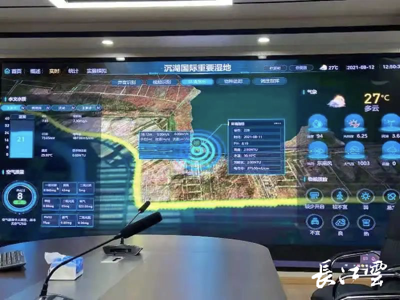 在沉湖湿地管理局大楼里,工作人员通过智慧管理系统,可实时监测显示湿地水质、空气质量、气象、鸟类种类和数量等各种动态信息,这是生态智慧监管平台的作用。
