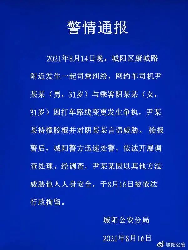 通报称,8月14日晚,城阳区康城路附近发生一起司乘纠纷,网约车司机尹某某(男,31岁)与乘客阴某某(女,31岁)因打车路线变更发生争执,尹某某持橡胶棍并对阴某某言语威胁。