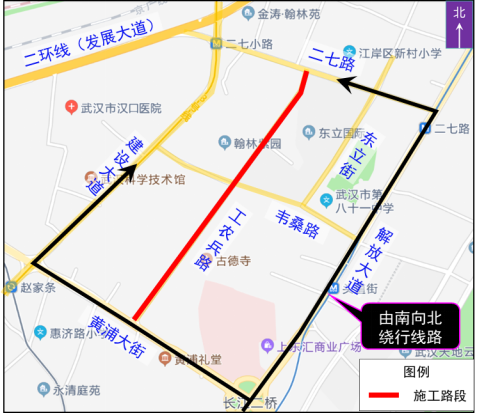 原沿工农兵路由北向南前往黄浦大街方向的车辆,可绕行二七路、建设大道、解放大道等周边道路。