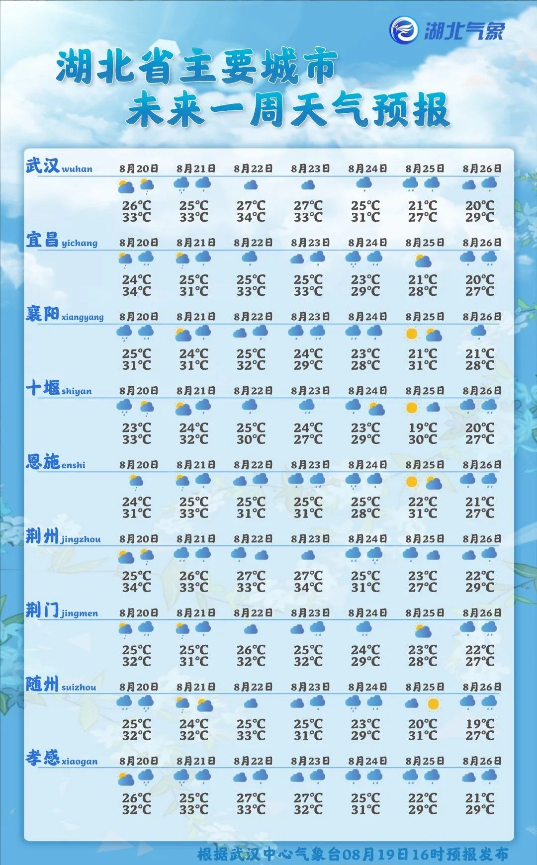湖北省主要城市一周天气预报