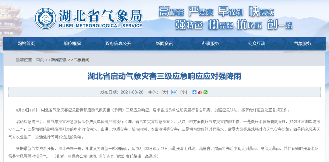 8月20日11时,湖北省气象灾害应急指挥部启动气象灾害(暴雨)三级应急响应,要求各成员单位切实履行各自职责,加强应急联动,抓紧做好应急处置各项工作。