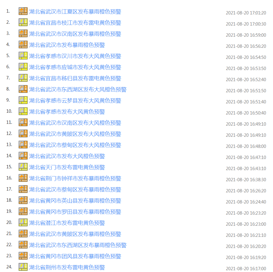 今天中午12时起,湖北各地气象部门连发95条预警