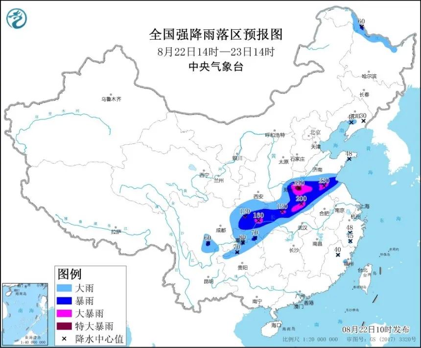 预计,8月22日14时至23日14时,四川东部和南部、重庆、贵州北部、陕西南部、河南大部、湖北西部和北部、安徽北部、江苏北部、山东南部及黑龙江北部等地有大到暴雨。