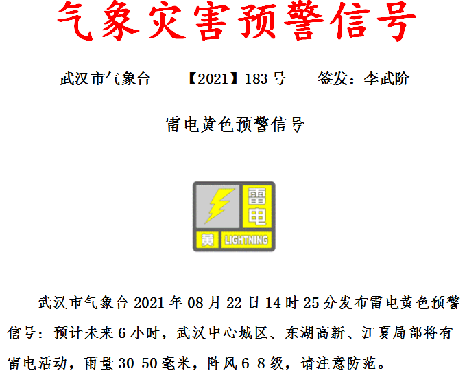 武汉市气象台今天14时25分发布雷电黄色预警,请注意防范!