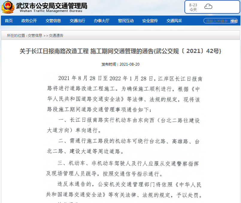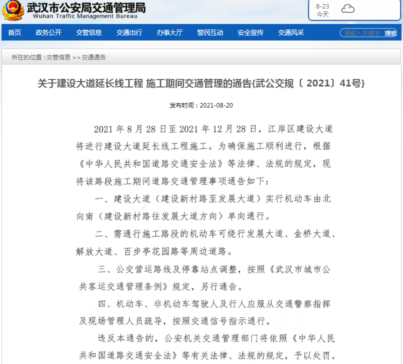 武汉市公安局交通管理局发布交通通告:28日起,因工程施工,建设大道(建设新村路至发展大道)、长江日报南路实施交通管制。