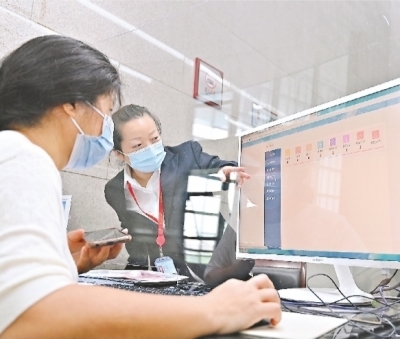 在武汉市民之家工程审批类“一事联办”窗口,窗口工作人员指导办事人员办理相关业务。